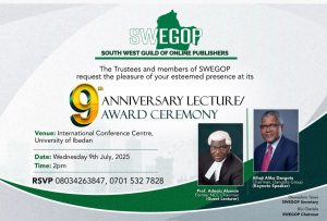 Ibadan, Nigeria – The South West Guild of Online Publishers (SWEGOP) will on Wednesday, July 9, 2025 host its 9th Anniversary Lecture and Award Ceremony at the International Conference Centre, University of Ibadan.